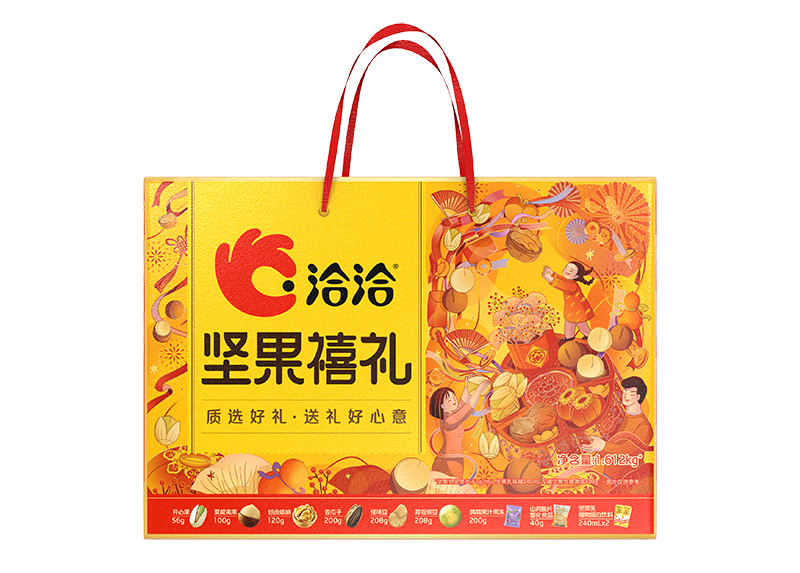 内容物:开心果56g、夏威夷果100g、纸皮核桃120g、香瓜子200g、怪味豆208g、蒜香豌豆208g、蒟蒻果汁果冻200g、山药脆片膨化食品40g、坚果乳植物蛋白饮料240mL*2